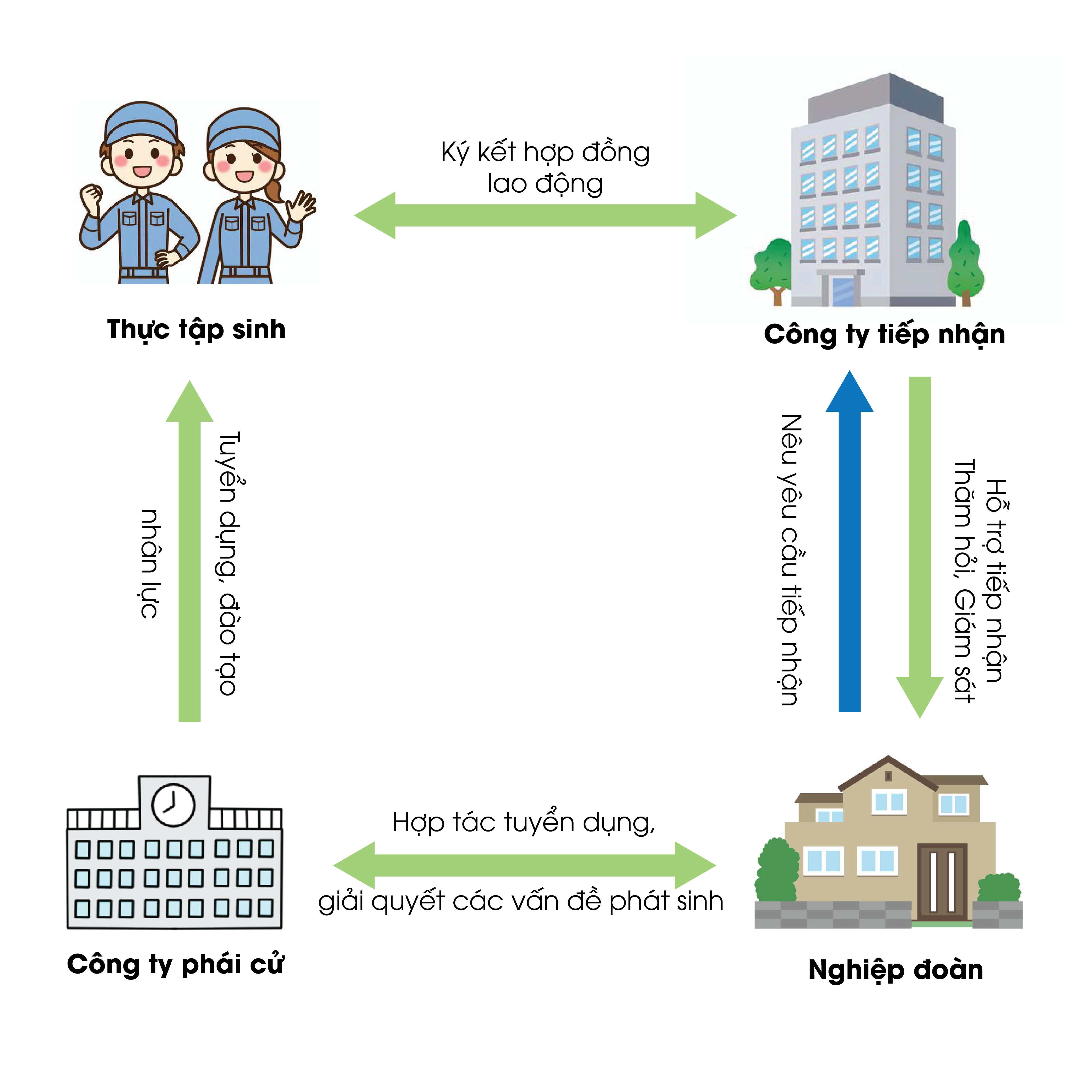 | Chuẩn bị hồ sơ phái cử. Thực hiện giờ học trước nhập cảnh | Xin giấy chứng nhận kế hoạch thực tập → Xin giấy chứng nhận tư cách lưu trú cho thực tập sinh |